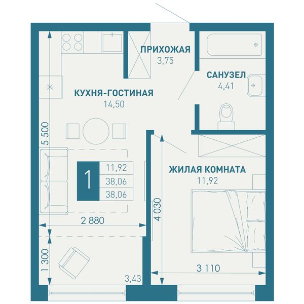 1-комнатная — 38,06 м²