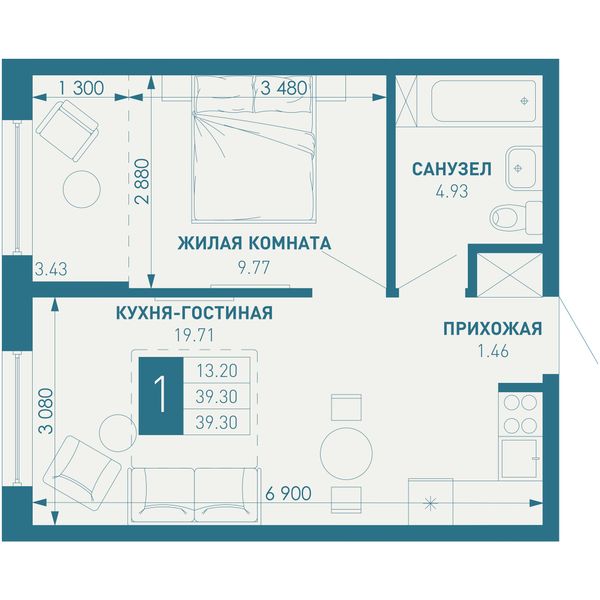 1-комнатная — 39,3 м²