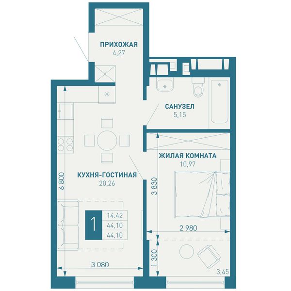 1-комнатная — 44,1 м²
