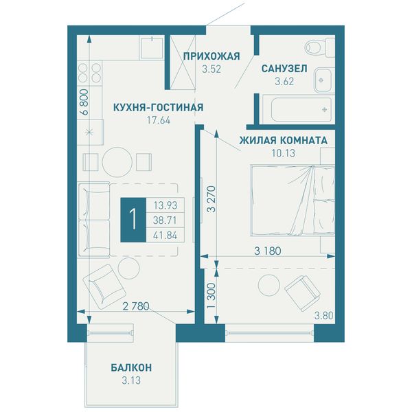 1-комнатная — 41,84 м²