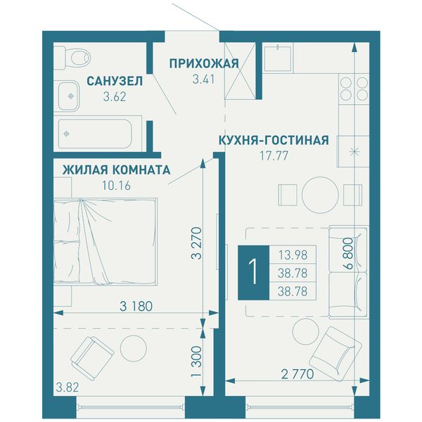 1-комнатная — 38,78 м²