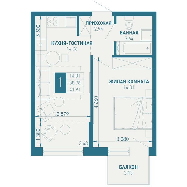 1-комнатная — 41,91 м²