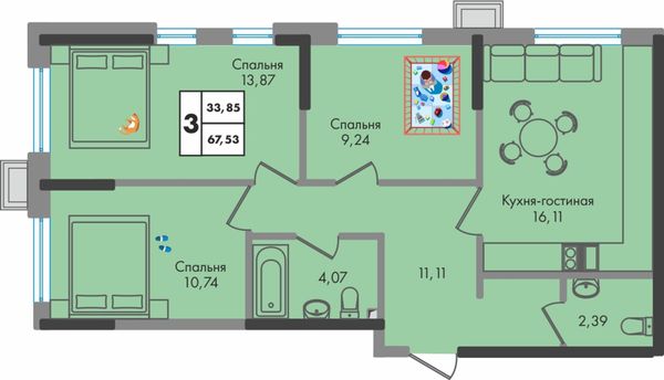 3-комнатная — 67,53 м²