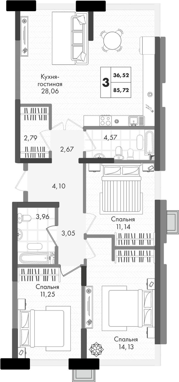 3-комнатная — 85,72 м²