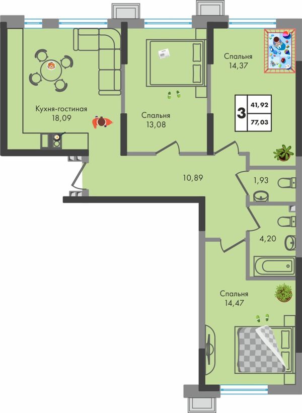 3-комнатная — 77,03 м²