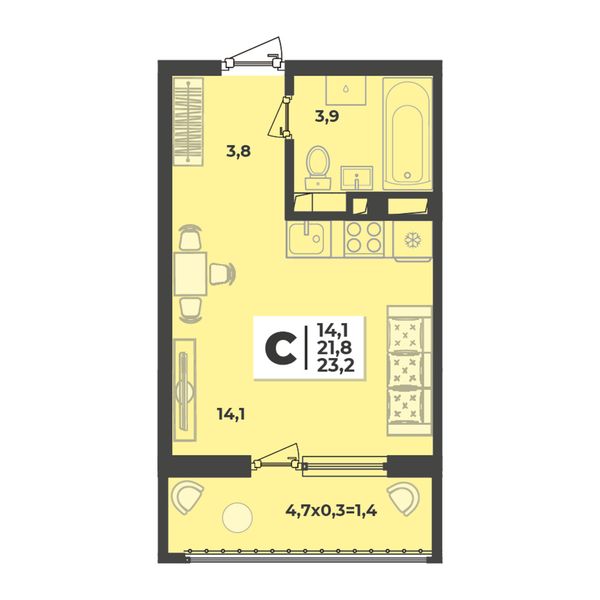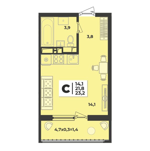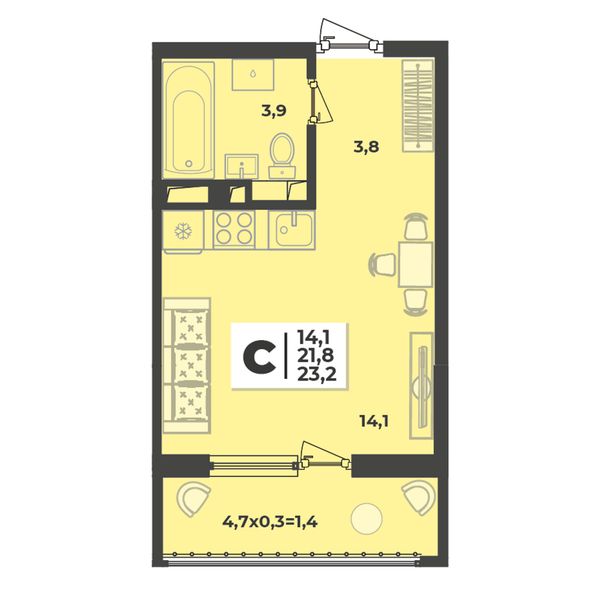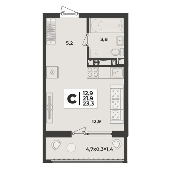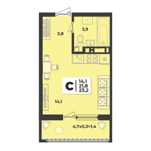1-комнатная — 23,3 м²