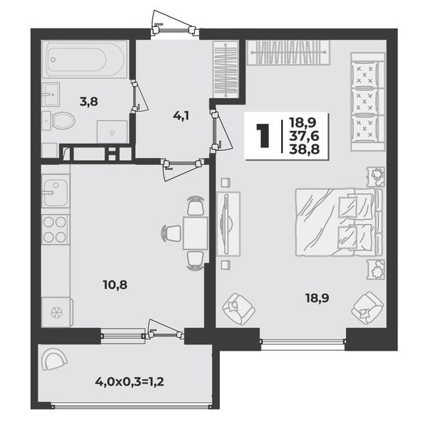 1-комнатная — 38,8 м²