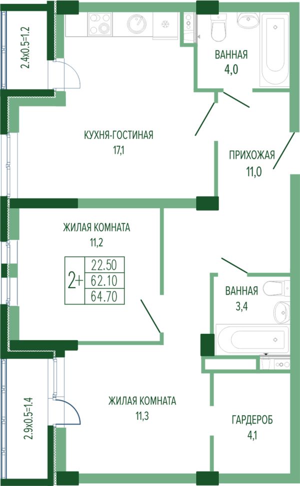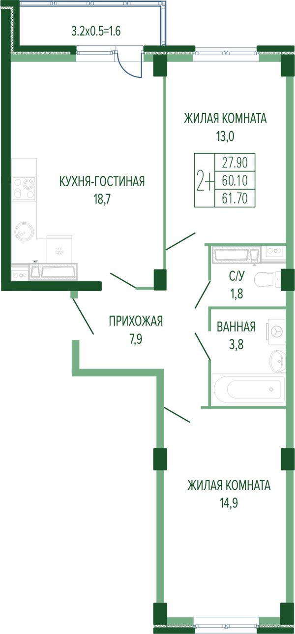 2-комнатная — 61,9 м²