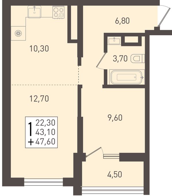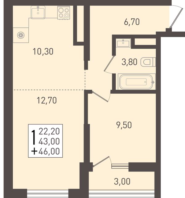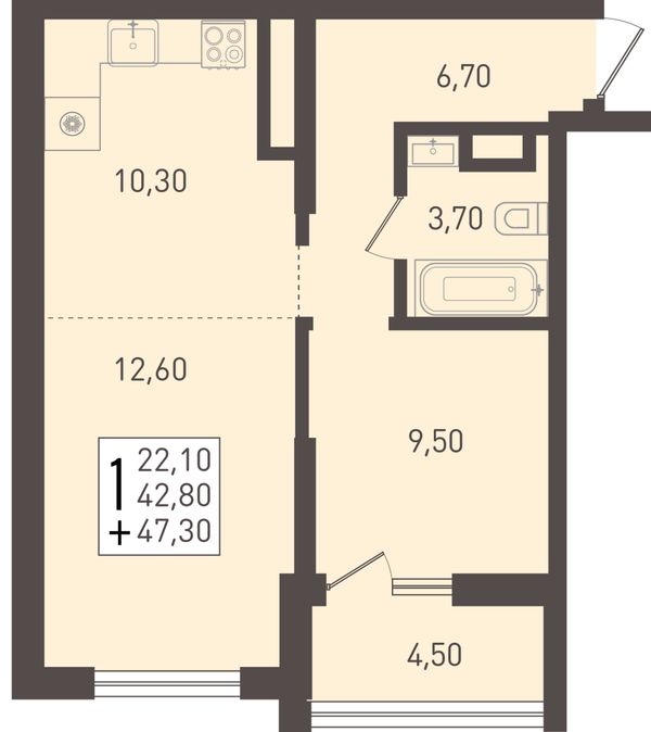 1-комнатная — 42,8 м²