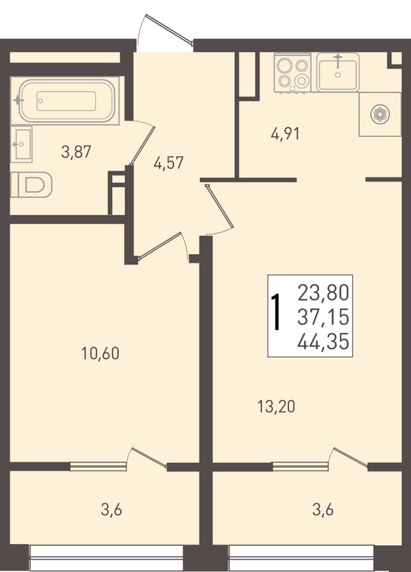 1-комнатная — 44,35 м²