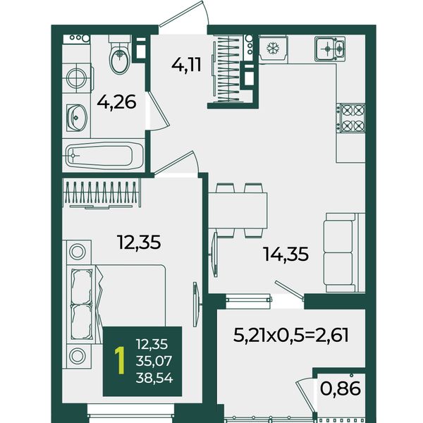1-комнатная — 38,54 м²