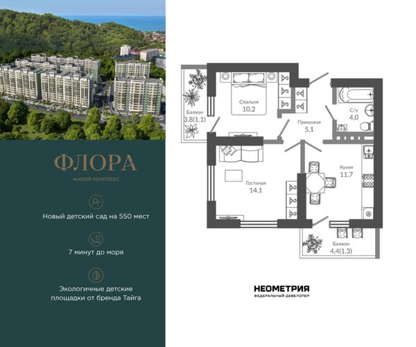Купить двухкомнатную квартиру в ЖК «Флора» в Сочи в Краснодарском крае
