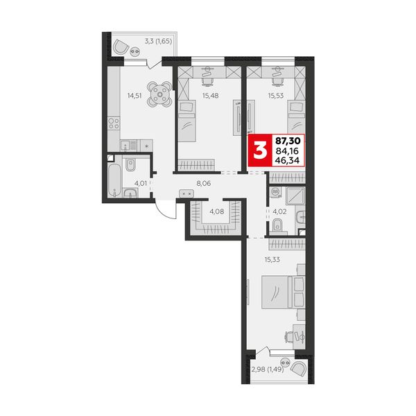 3-комнатная — 84,15 м²