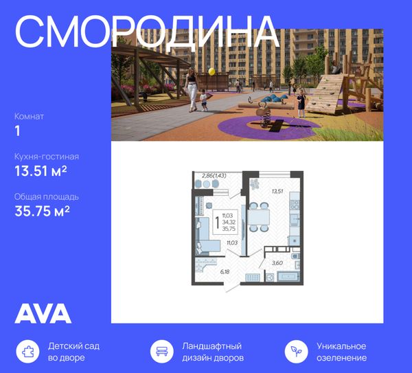 1-комнатная — 35,75 м²