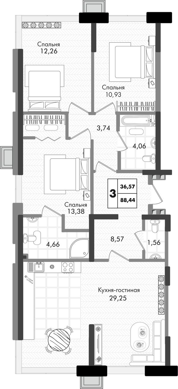 3-комнатная — 88,44 м²