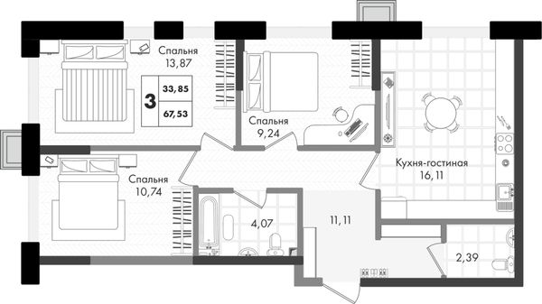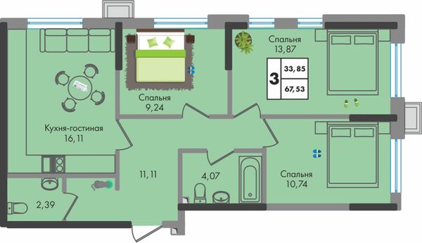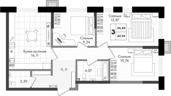 3-комнатная — 67,53 м²