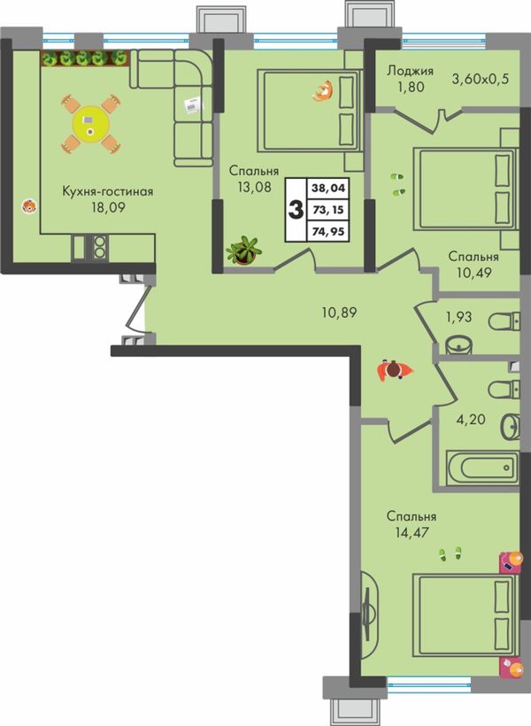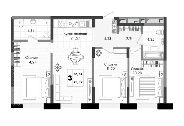 3-комнатная — 73,89 м²