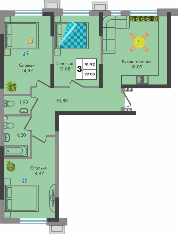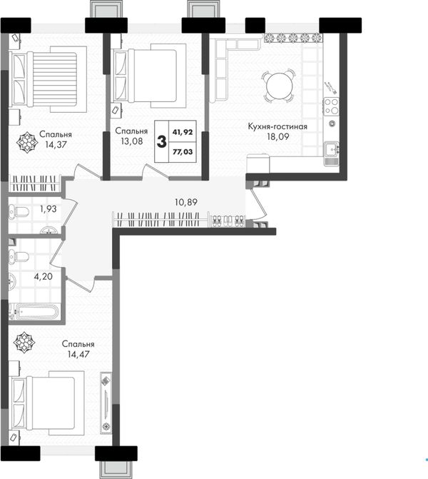 3-комнатная — 77,03 м²