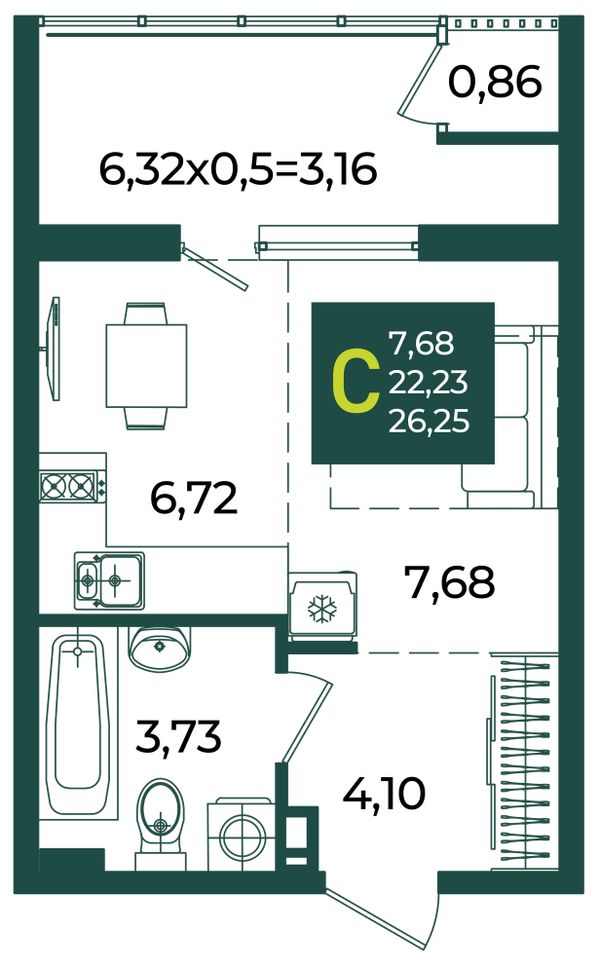 Студия — 26,25 м²