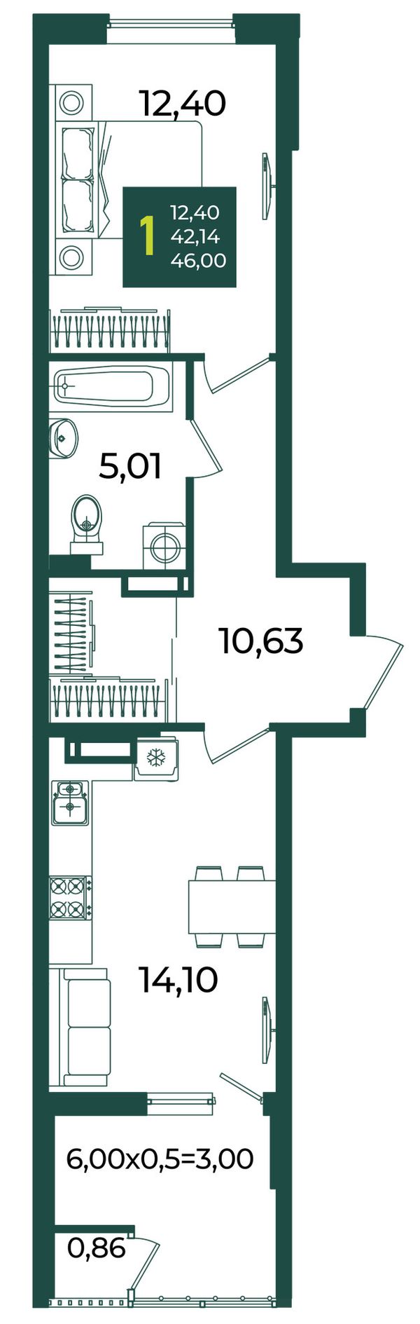 1-комнатная — 46 м²