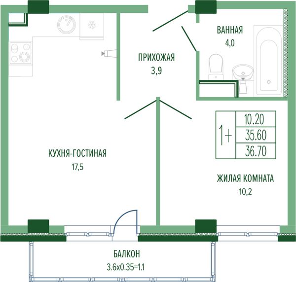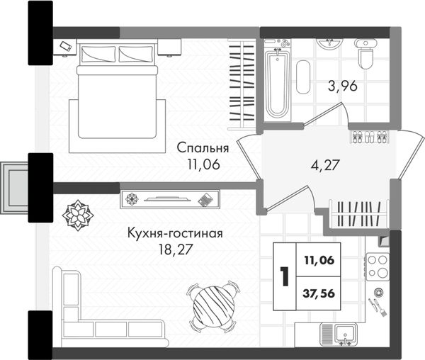 1-комнатная — 37,56 м²