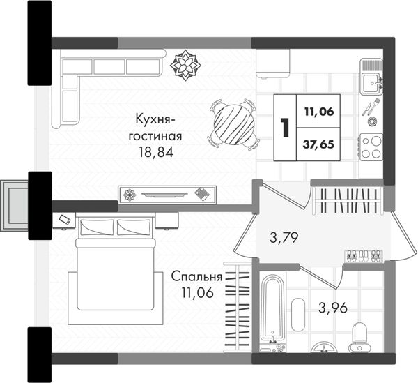 1-комнатная — 37,65 м²