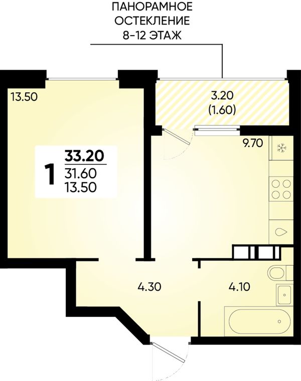 1-комнатная — 33,2 м²