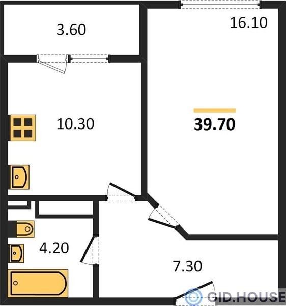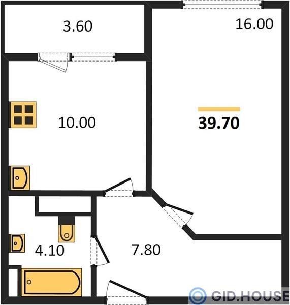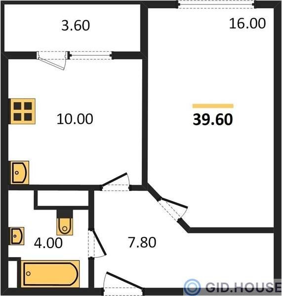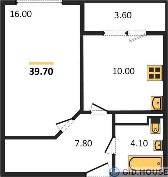 1-комнатная — 39,5 м²