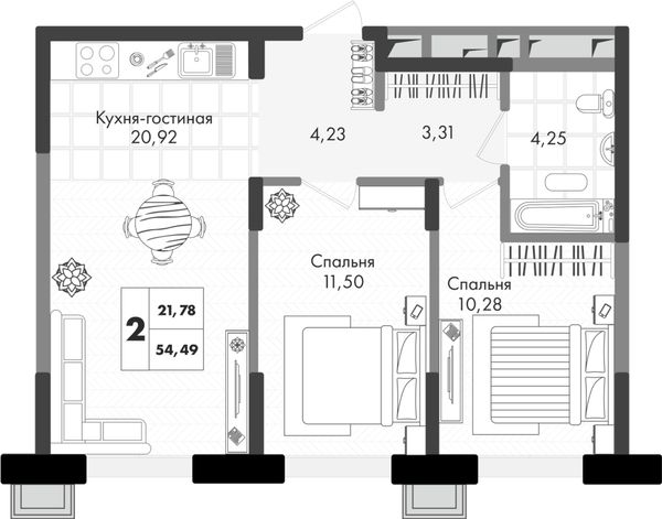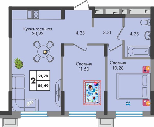 2-комнатная — 54,49 м²