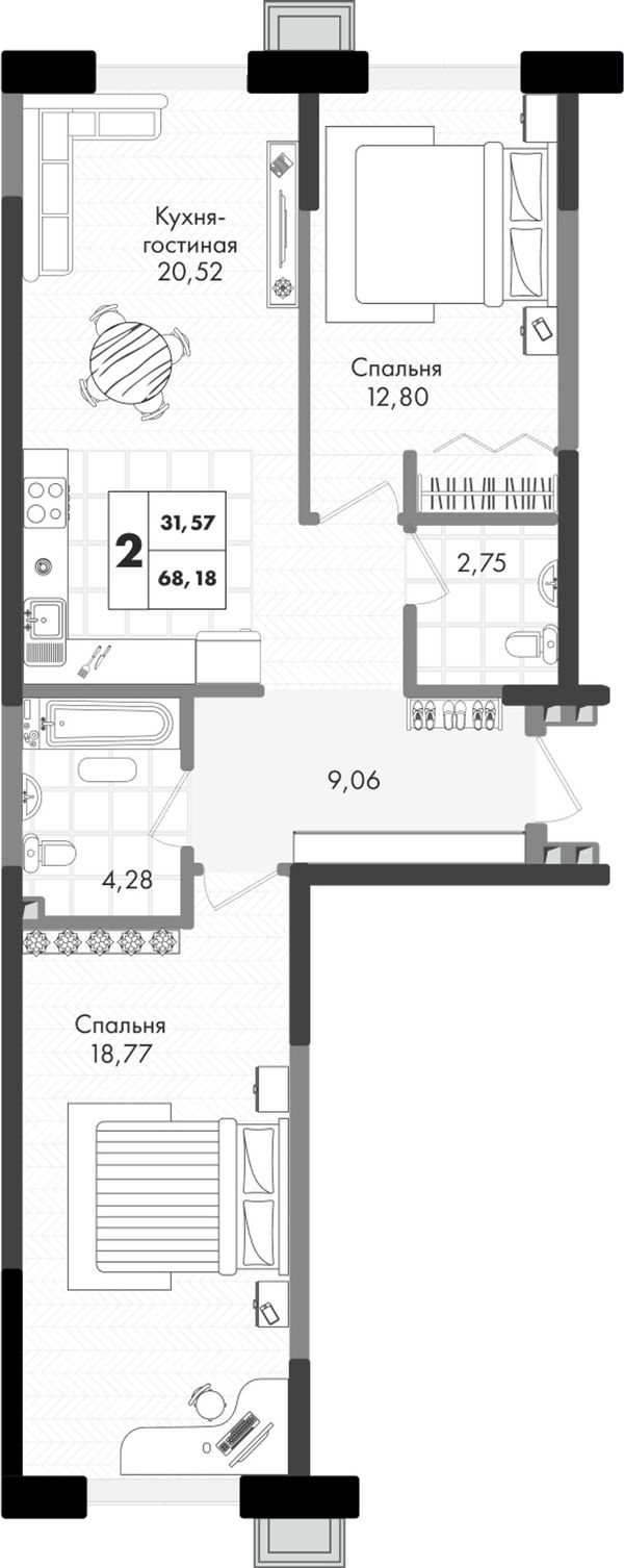 2-комнатная — 68,18 м²