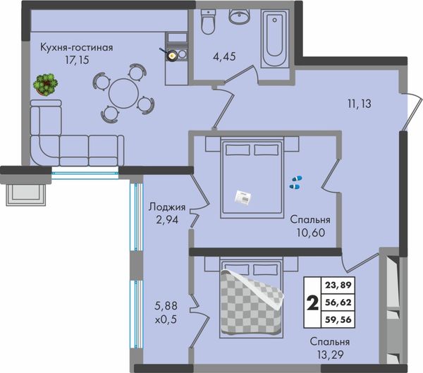 2-комнатная — 59,55 м²