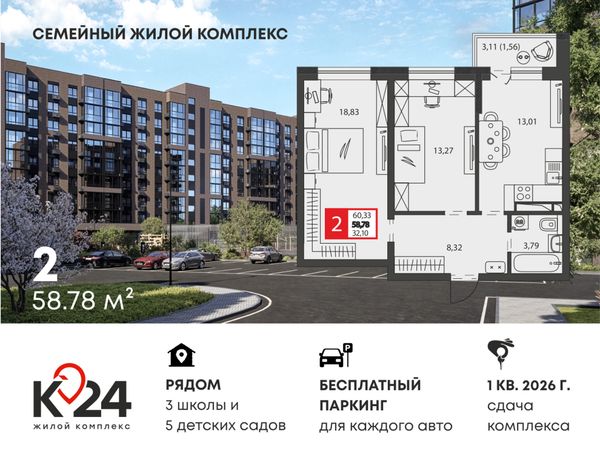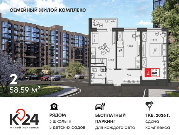 2-комнатная — 58,59 м²