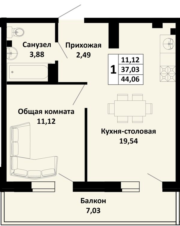 1-комнатная — 44,06 м²