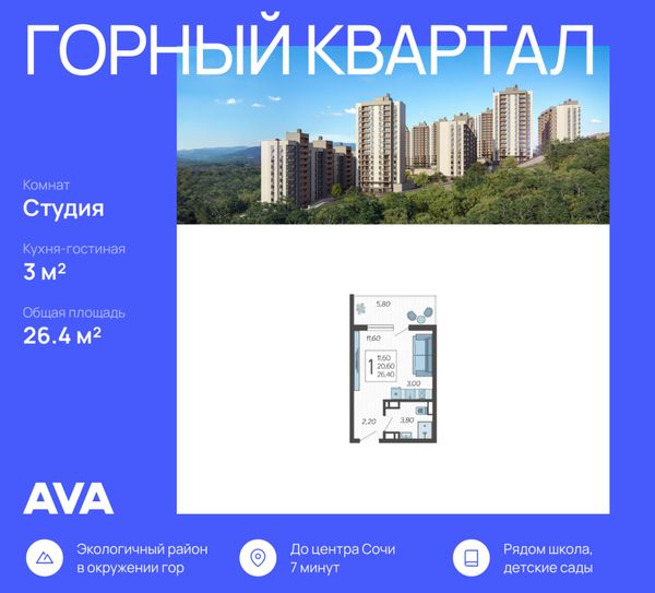 Купить квартиру-студию в ЖК «Горный Квартал» в селе Раздольное в Краснодарском крае