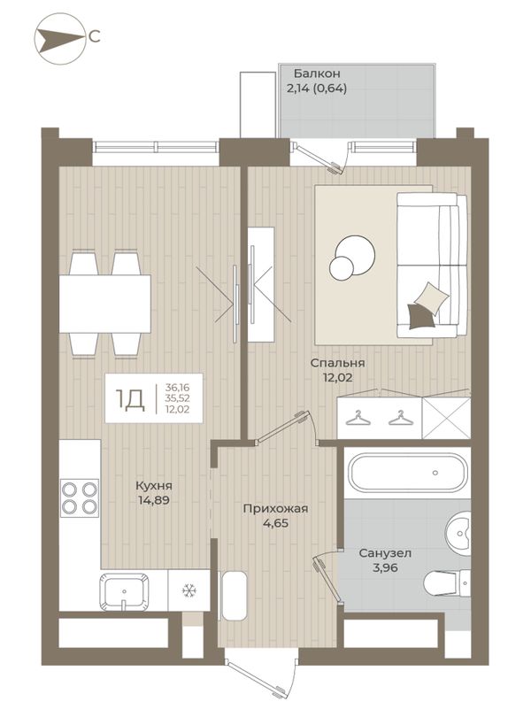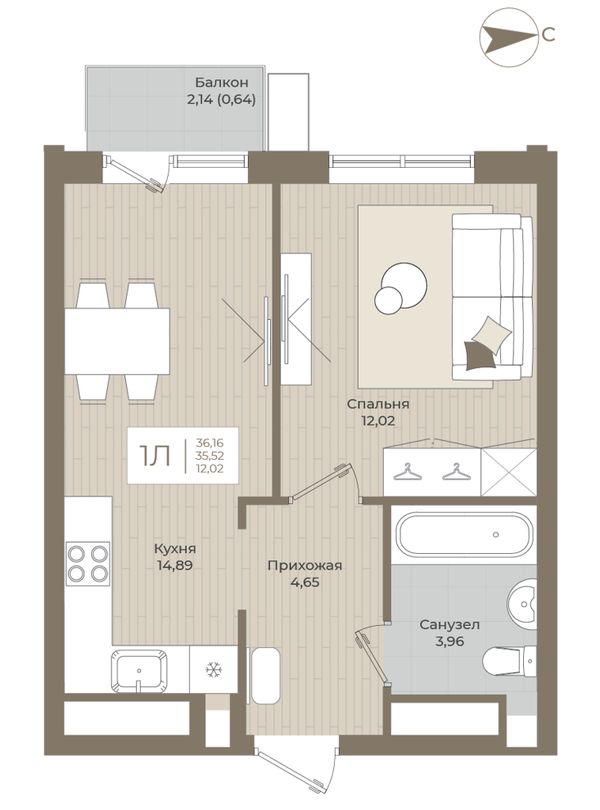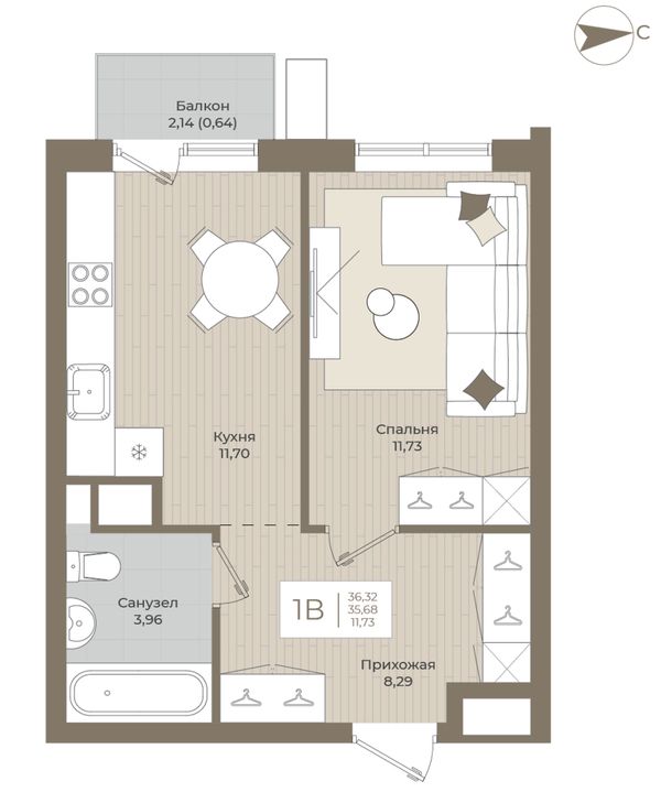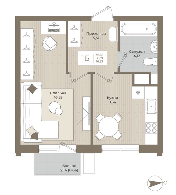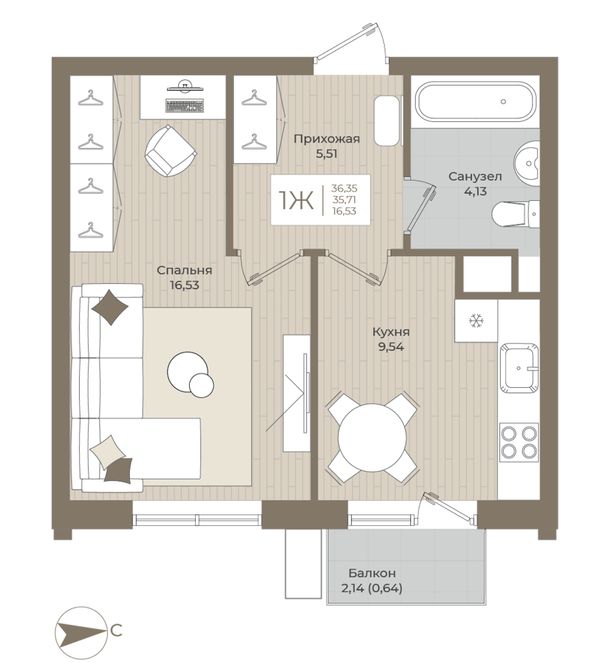 1-комнатная — 36,16 м²