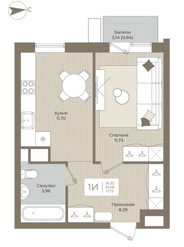 1-комнатная — 36,32 м²