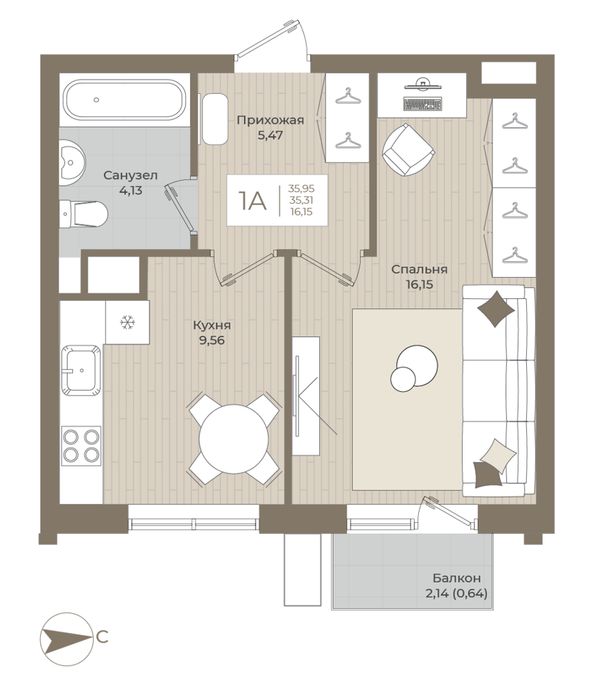 1-комнатная — 35,95 м²