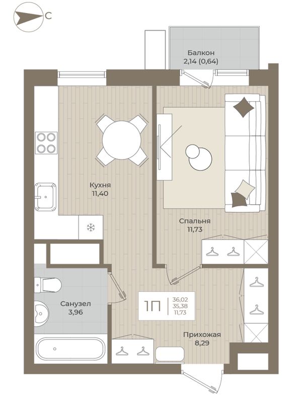1-комнатная — 36,02 м²