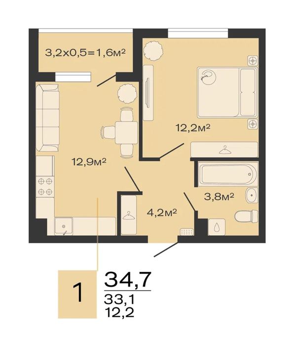1-комнатная — 34,7 м²