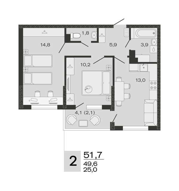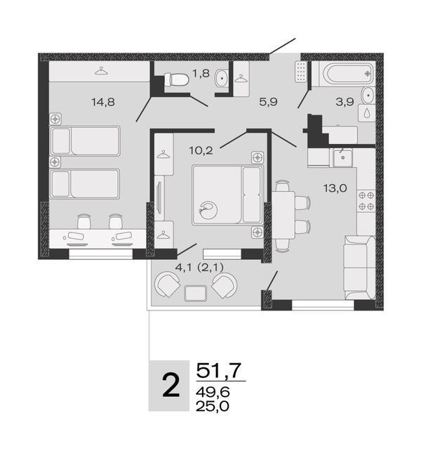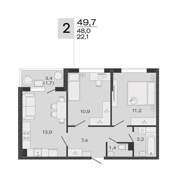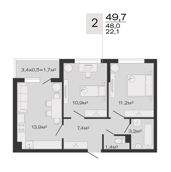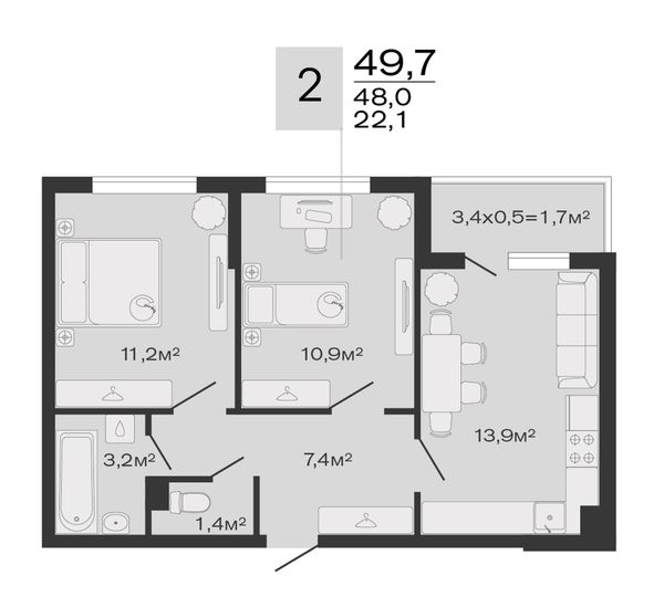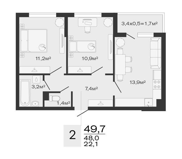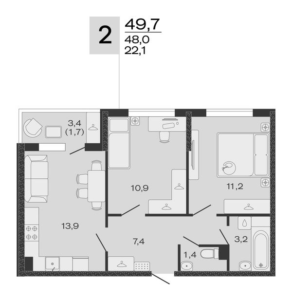 2-комнатная — 49,7 м²