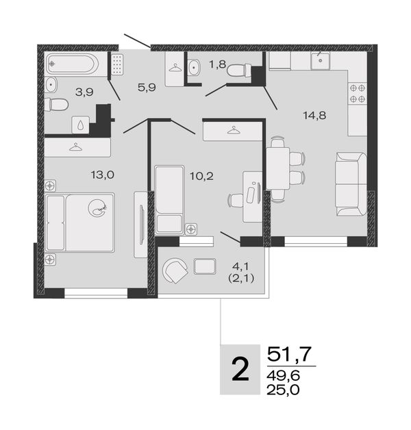 2-комнатная — 51,7 м²