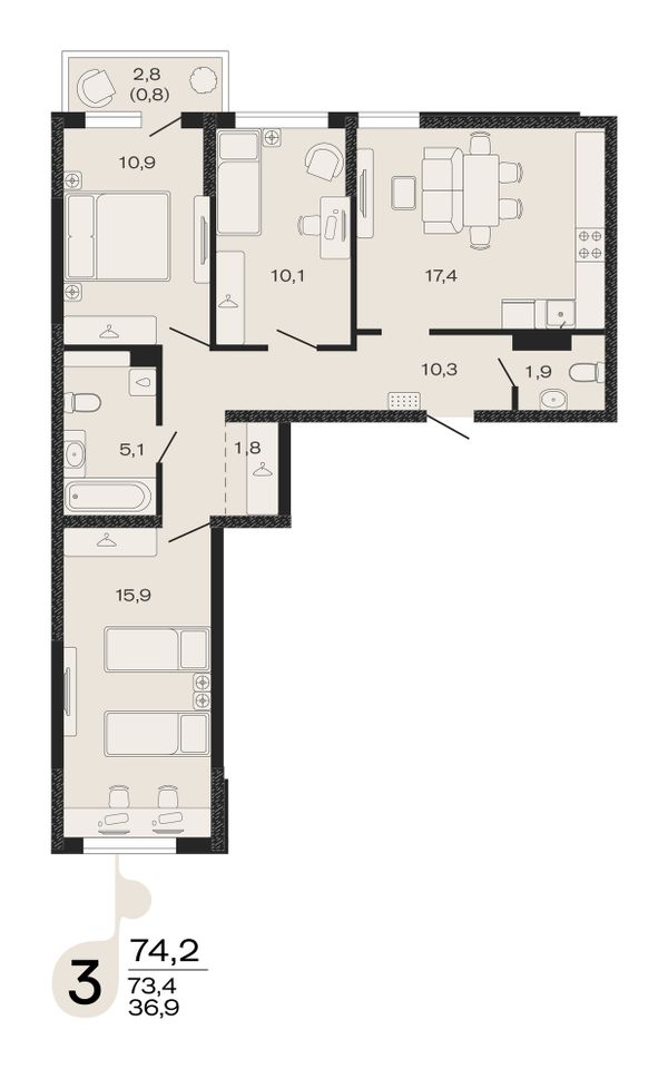 3-комнатная — 74,2 м²