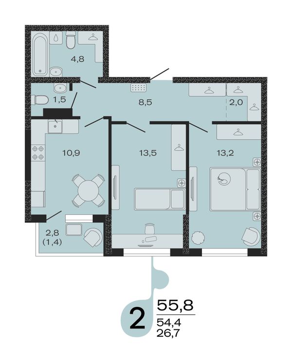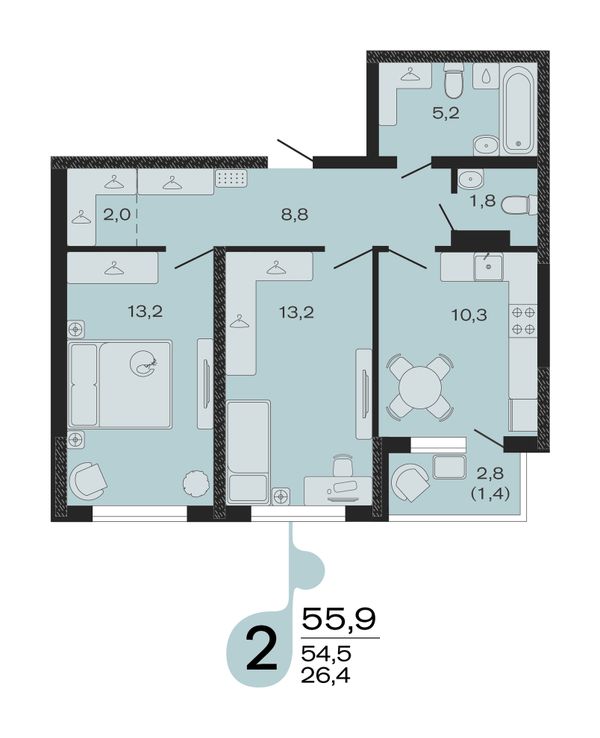 2-комнатная55,8 м²Краснодарский край, Новокубанск, Берёзовая улица