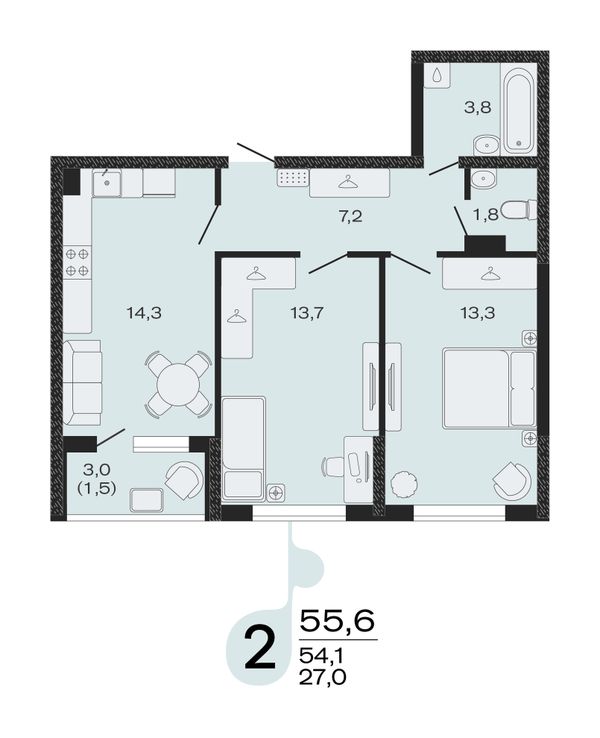 2-комнатная55,6 м²Краснодарский край, Новокубанск, Берёзовая улица
