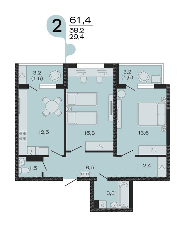 2-комнатная61,4 м²Краснодарский край, Новокубанск, Берёзовая улица