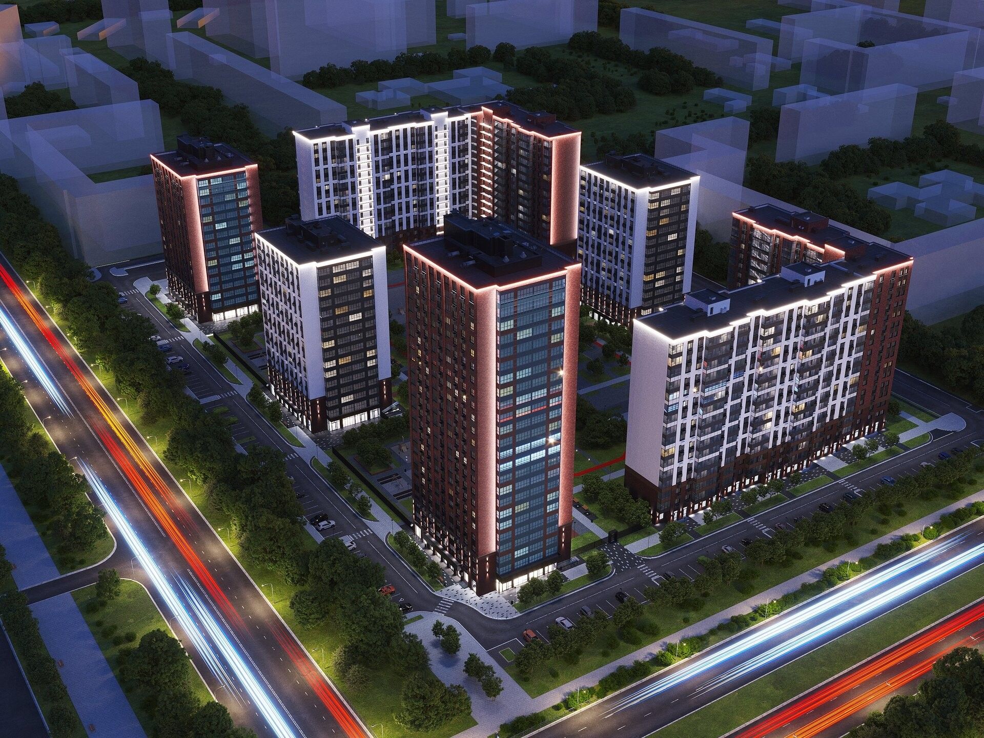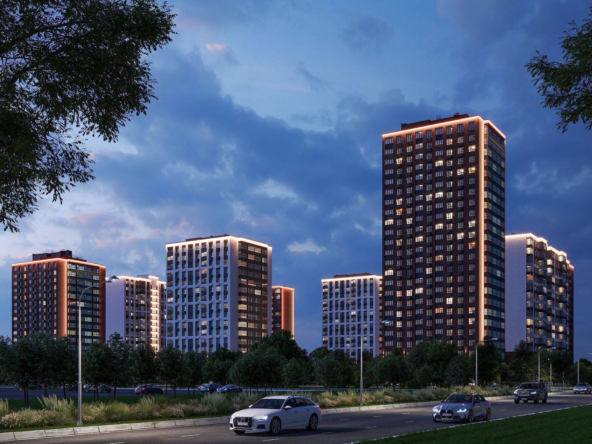 Строгая пластика фасадов и тёплая цветовая гамма создают спокойную, «респектабельную» подачу. Вечером квартал читается с расстояния: аккуратная архитектурная подсветка подчёркивает силуэты домов и «держит» атмосферу камерности.