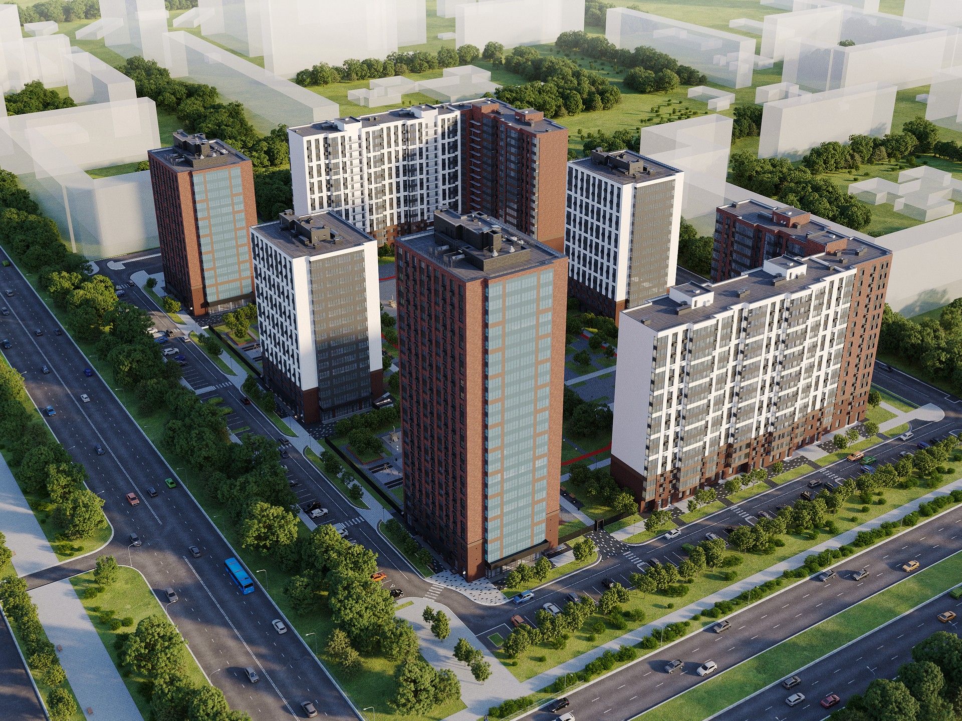- Масштаб: 6 домов, 16–24 этажа.