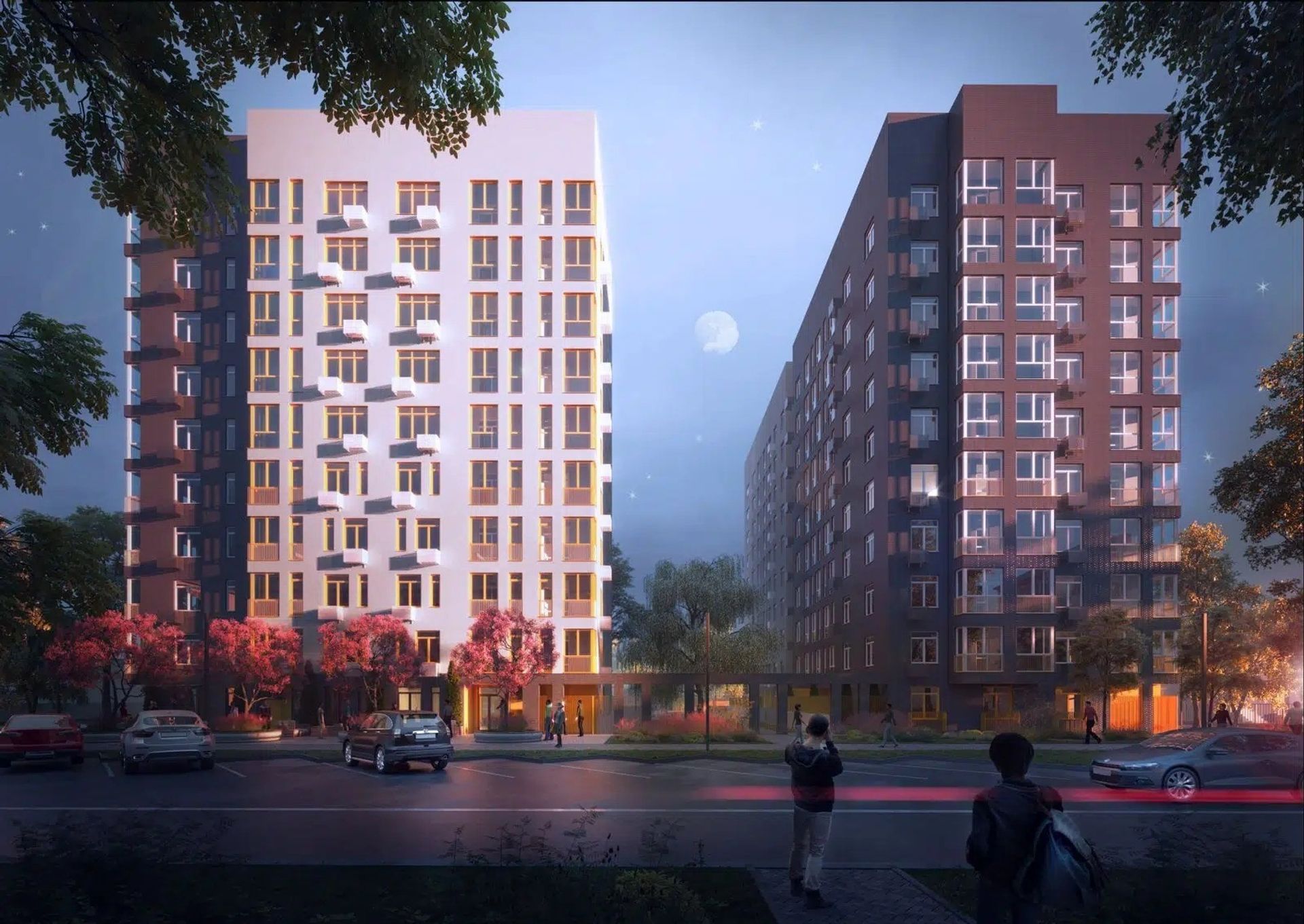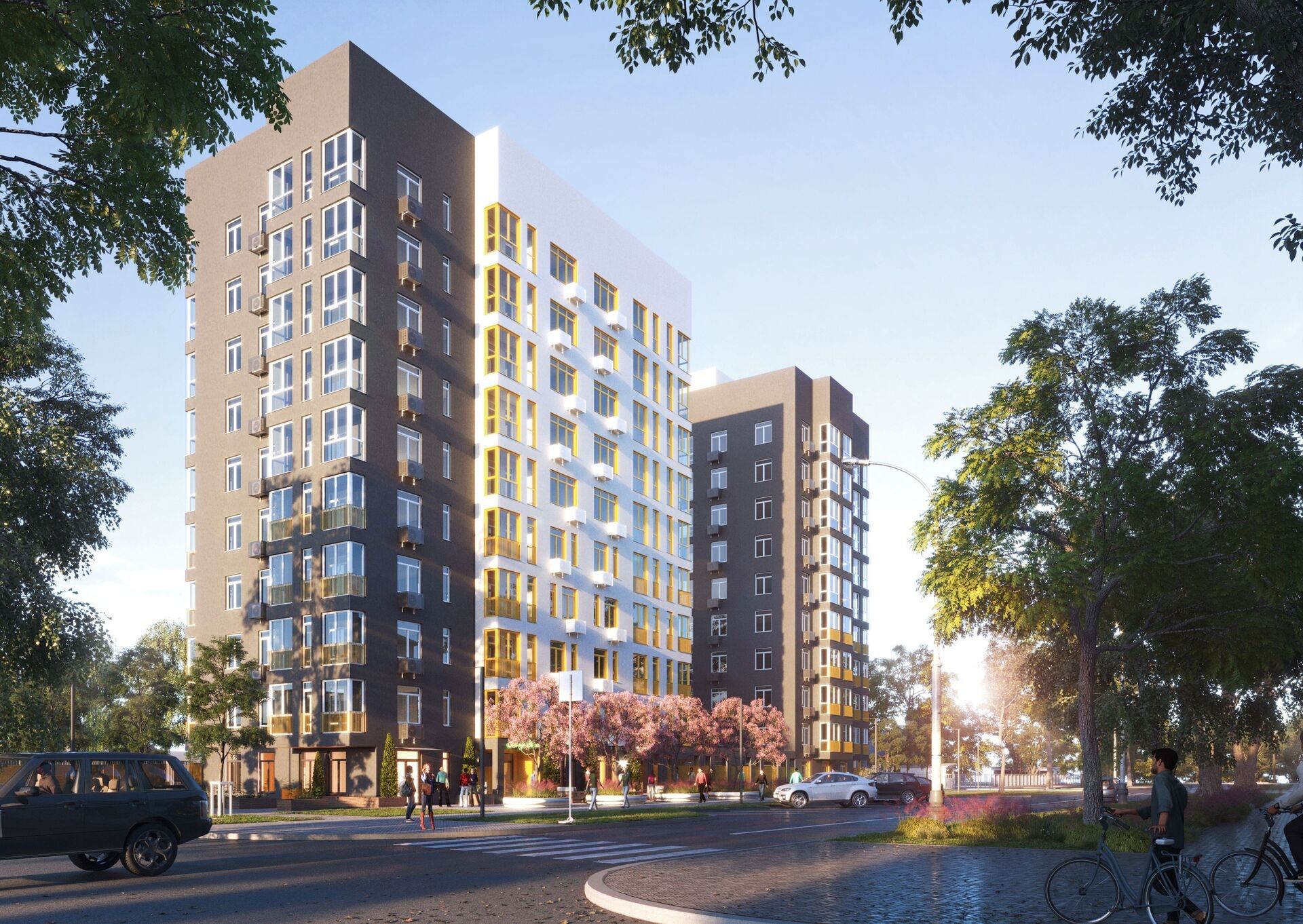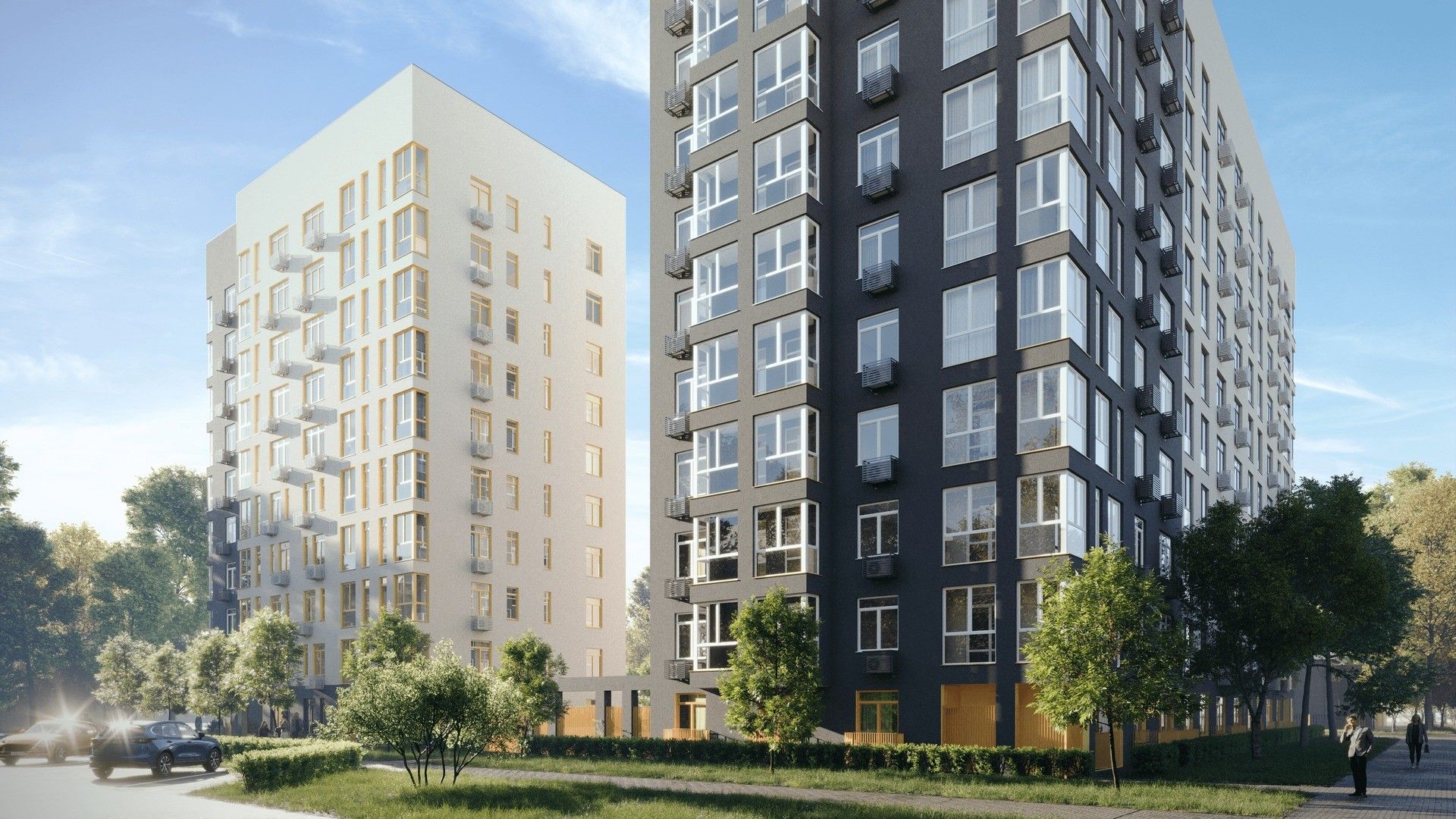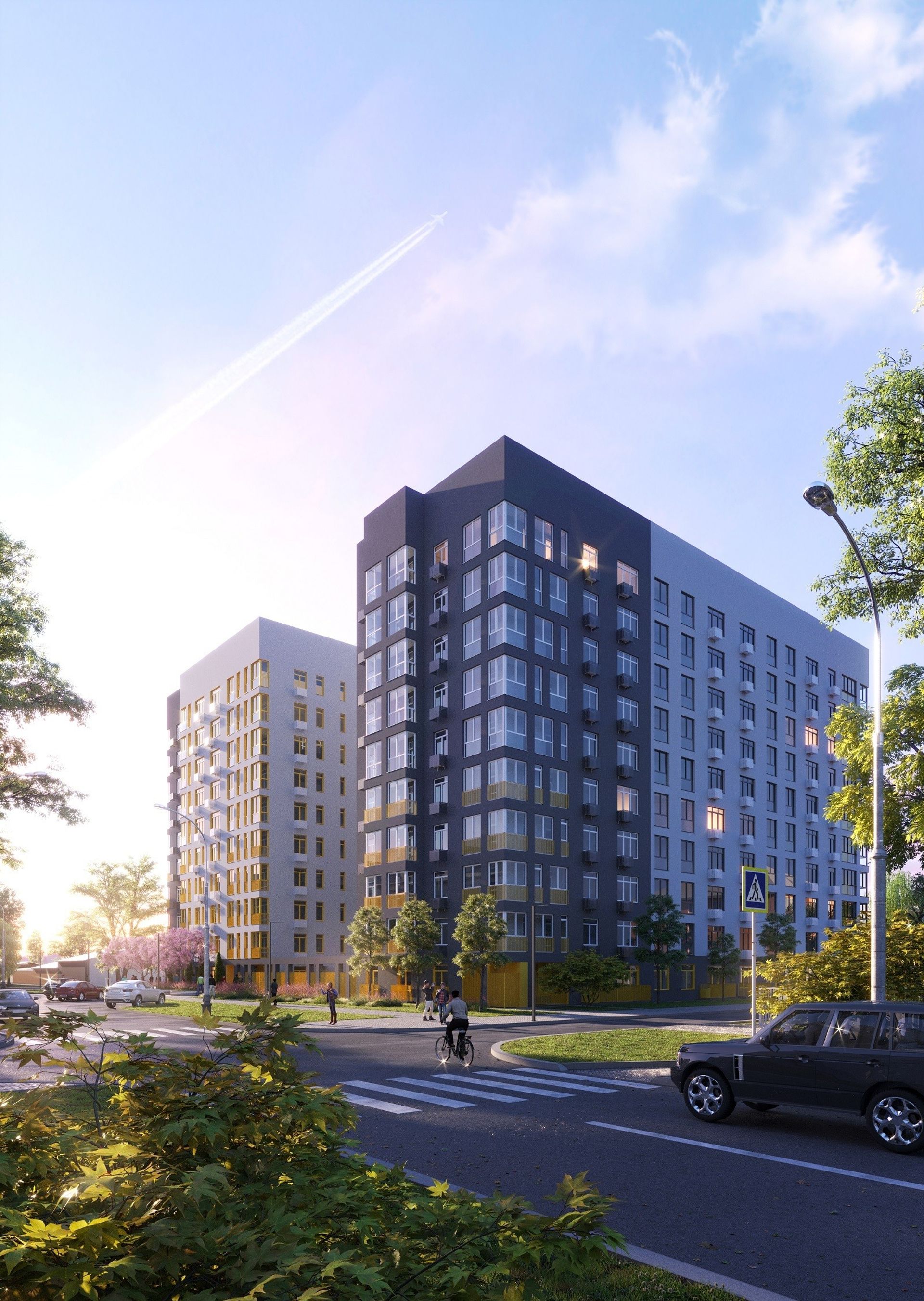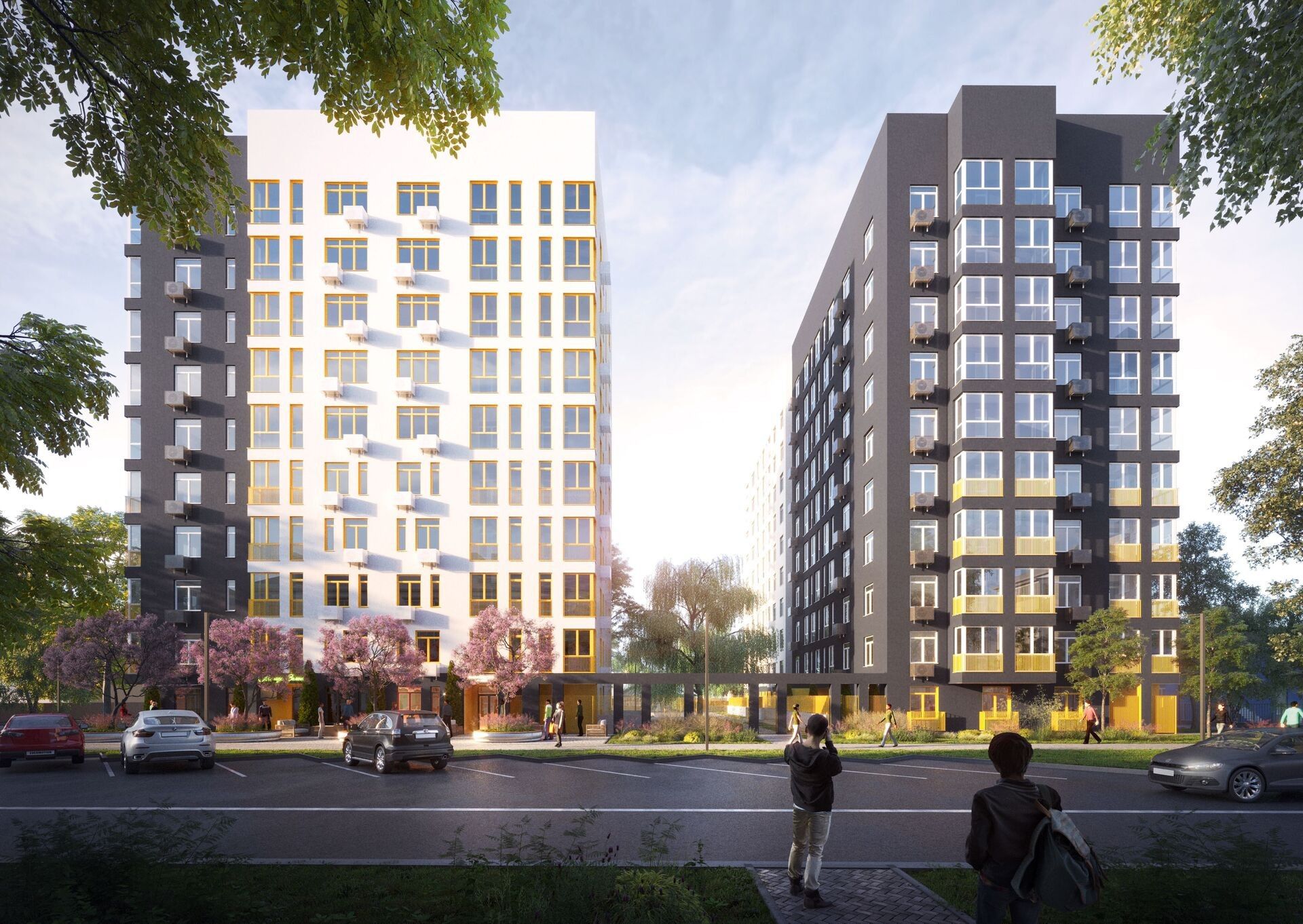 Две доминанты района соединены аркой: так во двор попадает больше света. Фасад собран из спокойных оттенков и функциональных деталей — корзины для кондиционеров, цветные ограждения лоджий и террас. Невысокая застройка вокруг обеспечивает виды, в том числе на Волгу.
