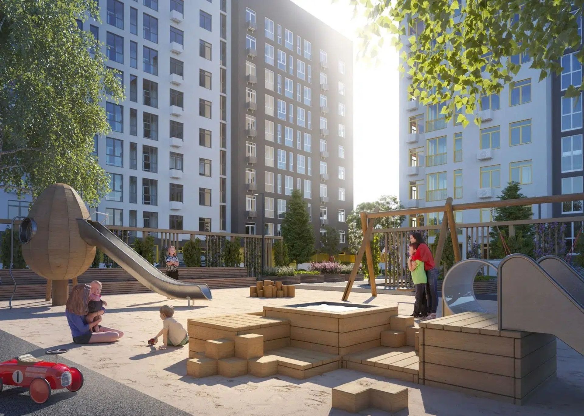 Во дворе — современные игровые зоны и уютные маршруты для прогулок. Пространство спроектировано так, чтобы и дневная суета, и вечерний отдых были одинаково комфортными.