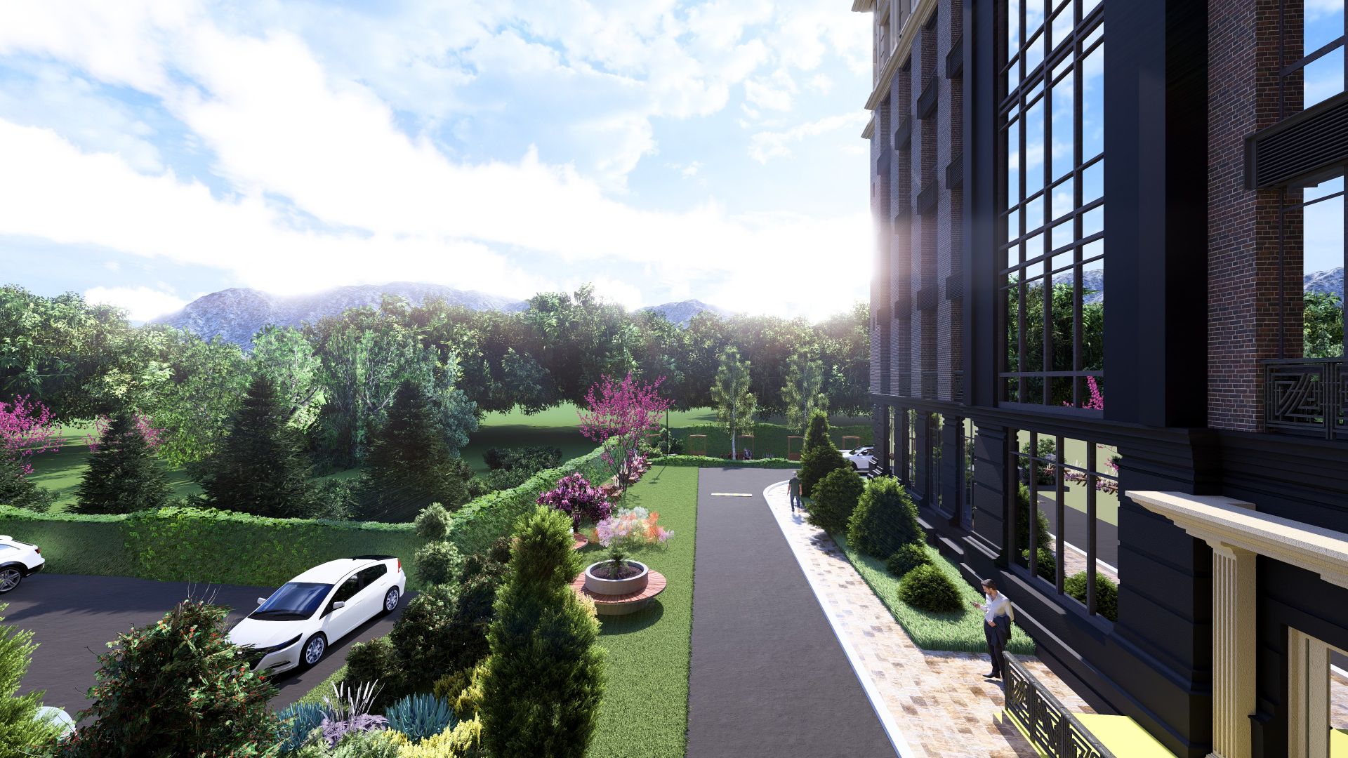 Фасады здания сочетают тёмный кирпич и светлые декоративные элементы, придавая дому выразительный ритм. Подъезды выполнены с парадным акцентом: широкие входные группы с декоративными колоннами создают ощущение респектабельности. Панорамное остекление подчёркивает современный характер проекта.